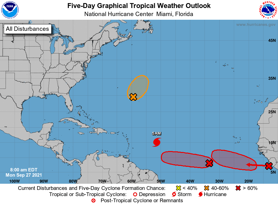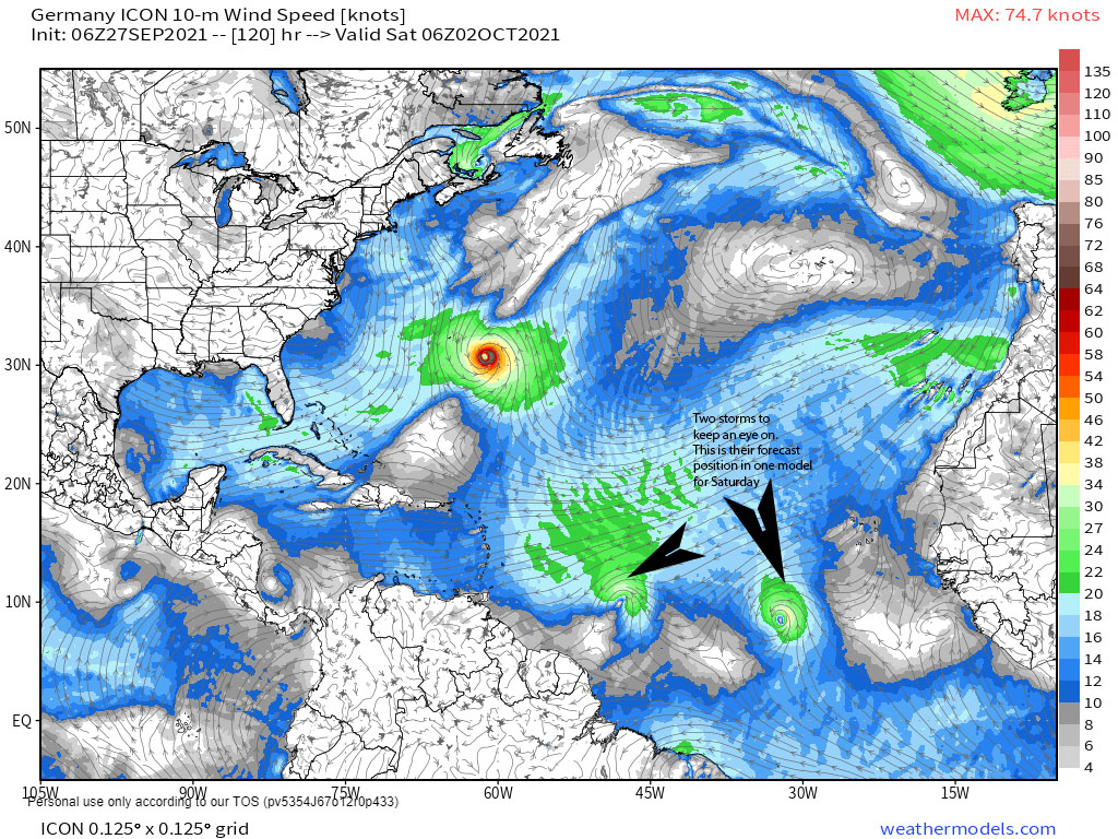 Tropical update for Sept. 27, 2021: We have two storms coming off the African coast. Both have an 80 percent chance of developing into a tropical depression over the next five days. It is always a little concerning when you see them this far south. Most models have these turning north and/or dissipating as they approach the Lesser Antilles, but this far out you never know. One model, the ICON from Germany, keeps them together as they approach the southern Lesser Antilles.. We’ll keep an eye on them.