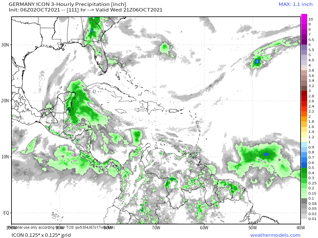 This is the German ICON model for Wednesday afternoon. This model shows widespread showers but does not show a rotating cyclone.