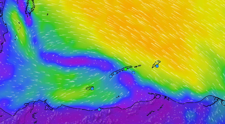 The difference between winds east to west will be especially big tomorrow morning. In this map you can see Guanaja and the east end getting brisk winds and the west end getting fairly calm conditions and Utila getting light winds from the west. East winds increase a bit Monday morning and get strong Monday evening into Tuesday morning at 25 mph and seas 4-5 feet before calming again during the day on Tuesday.