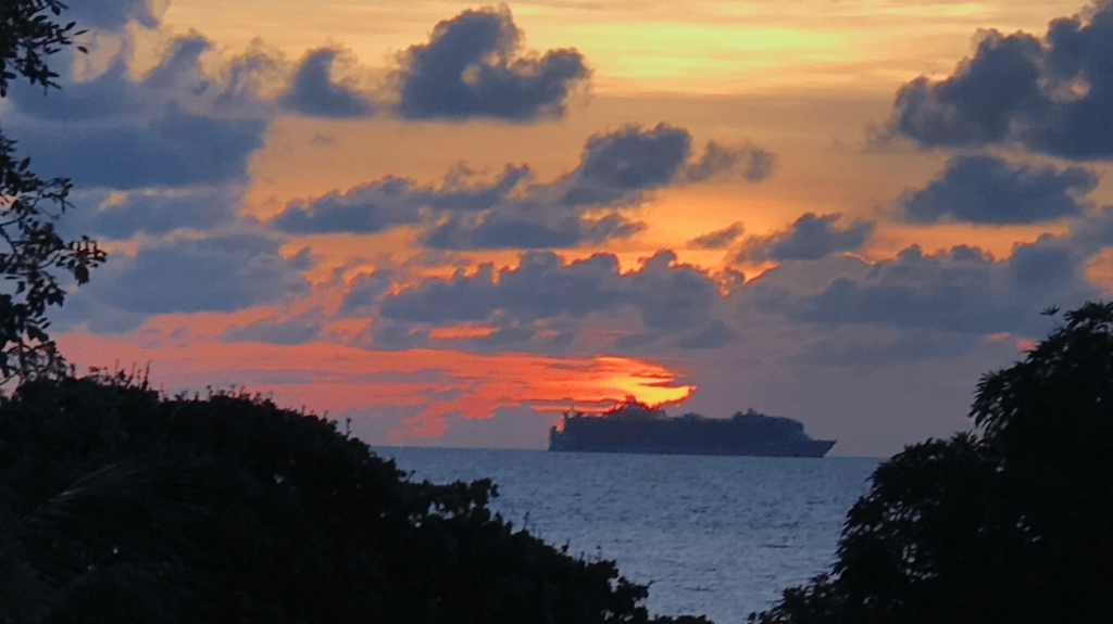 Good morning Bay Islands. Our photo of the day shows the sun setting over a cruise ship at Sandy Bay and is sent to us by James Oden. We have finally gotten our full allotment of Roatan Weather Calendars so if you ordered one and haven’t received it please message or Whatsapp me. If you haven’t ordered one and want one, please do the same. They are also available now at Hangover Hut, open daily from noon to 9 p.m. Thanks for your patience.