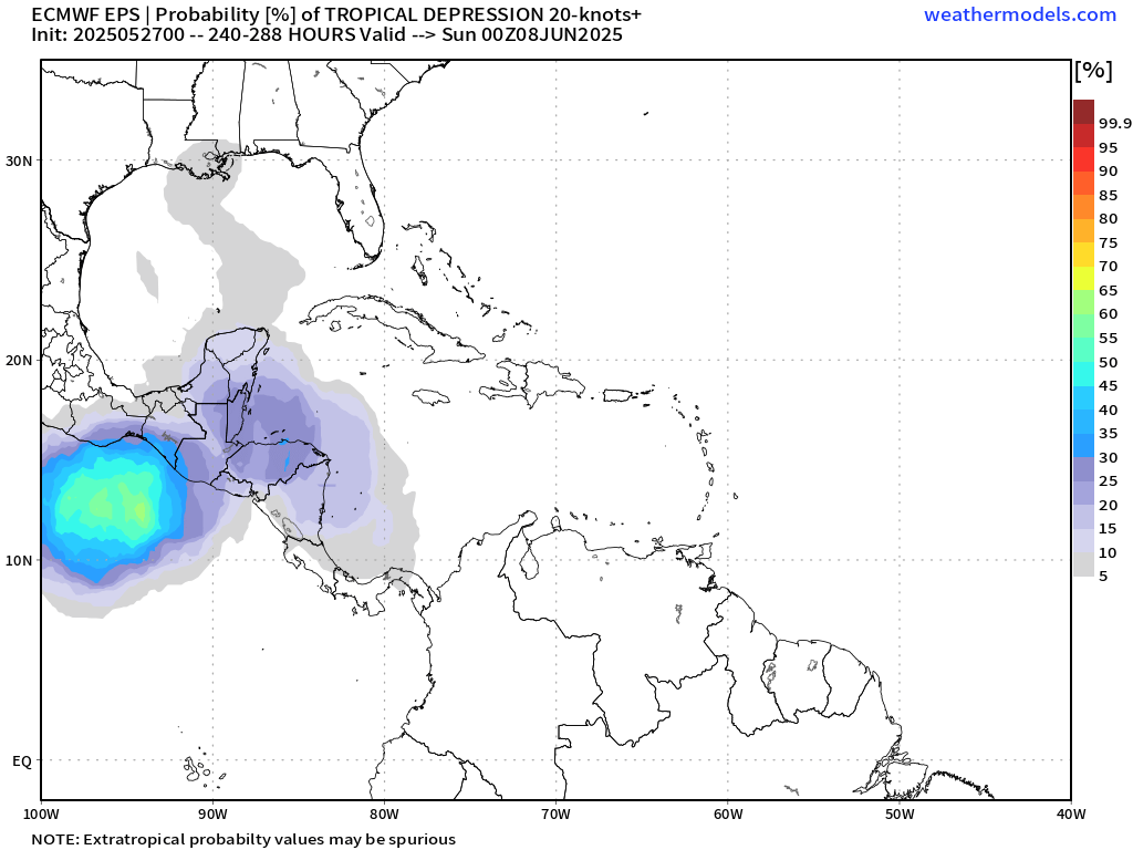 This is the Euro model showing chances of a tropical depression on June 8. Keep in mind that a tropical depression simply means that we have a circulation of winds and those winds are 38 mph or less. So windy and rainy, but not scary. This map puts the chances of that happening around June 8 at 30 percent. Keep in mind this is a week and a half off. Models that far out are notoriously bad, and they have a tendency to overestimate the chance of a tropical storm of some sort. So it is something to watch, but not something to worry about right now.