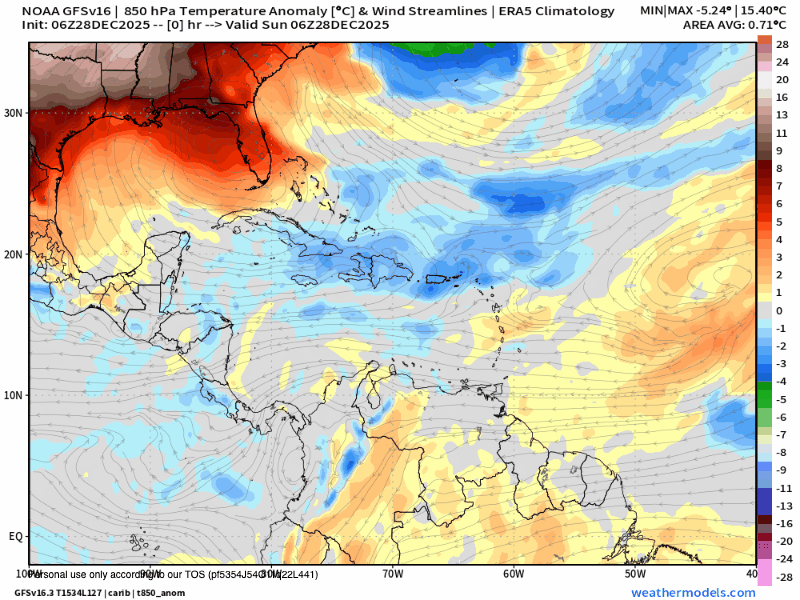 This is a mild norther, but we should get some fresher temperatures out of it. Here is the temperature anomaly forecast for the upper atmosphere. The blues are cooler temperatures. We are forecast for cooler conditions Wednesday through Friday, meaning we will mostly be in the 70s (low 20s C), with maybe a morning where a few of us get 68 or 69 (20C).