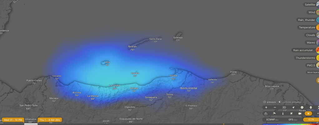Here is the rain forecast for 10 p.m. to 4 a.m. from the German ICON. They think you might be OK, unless you’re on Utila.
