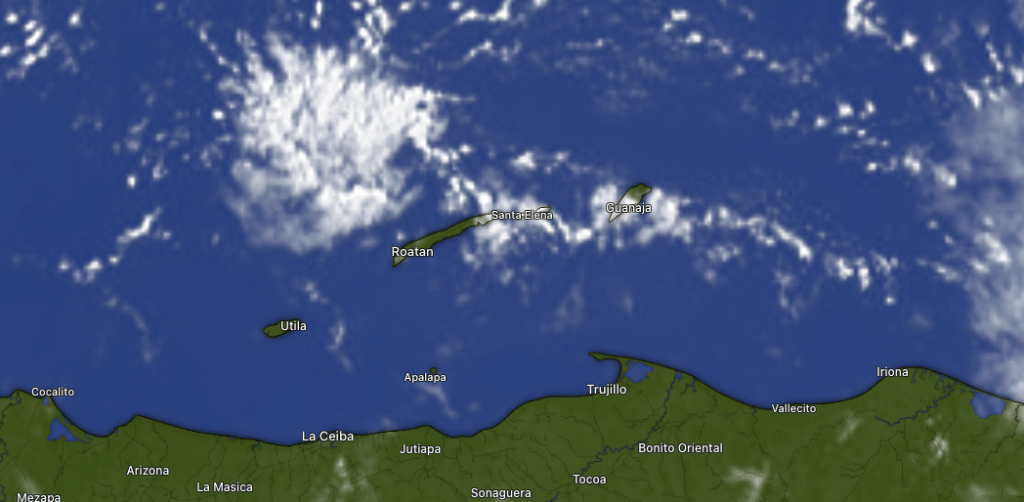 Our satellite image at 8:15 a.m. shows some popcorn clouds, that brought about a tenth of an inch of rain to Guanaja around 7:50 a.m. They are moving to the west, so we may see a shower here or there before 10 a.m. After that we should be dry. Dry conditions will dominate the week ahead, with only very small chances of morning showers.