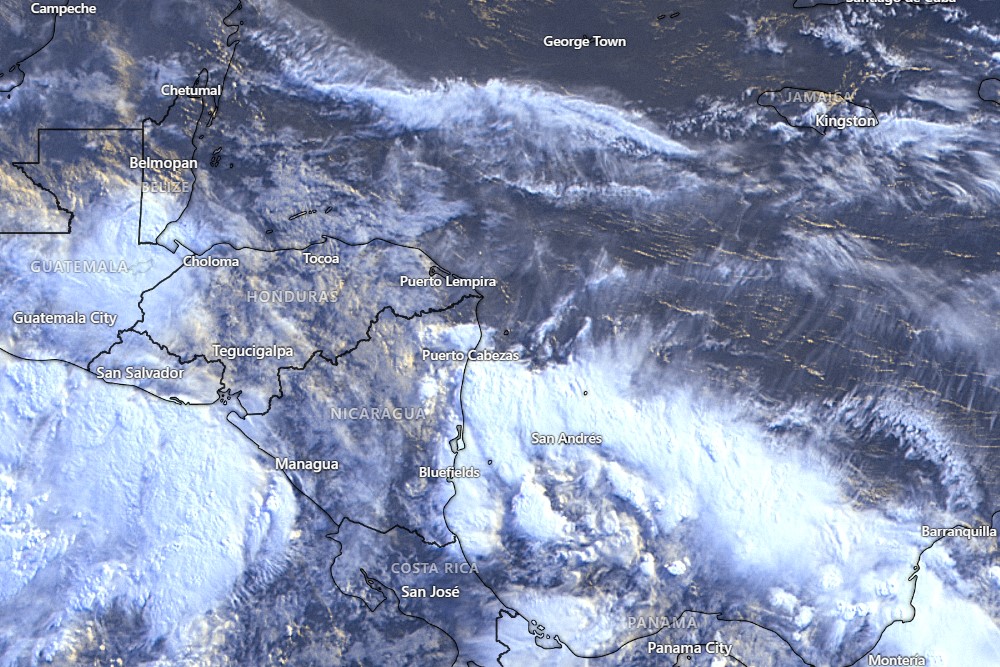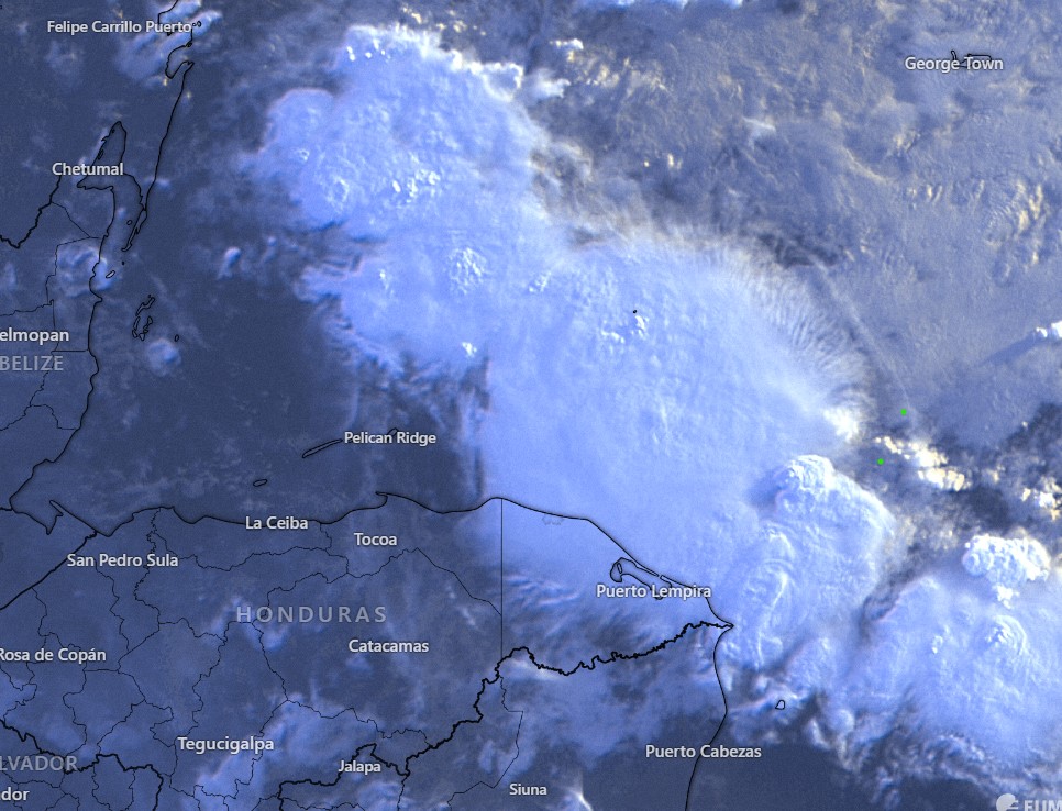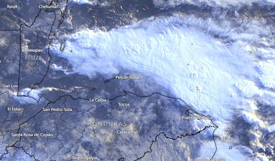 As you can see in this morning’s satellite, there is a big bank of clouds to our north and west. That will keep us in the clouds most of the day and with a decent chance of rain, especially on the east side of the island and definitely for Guanaja. Winds should pick up this evening, from the east around 25 mph.