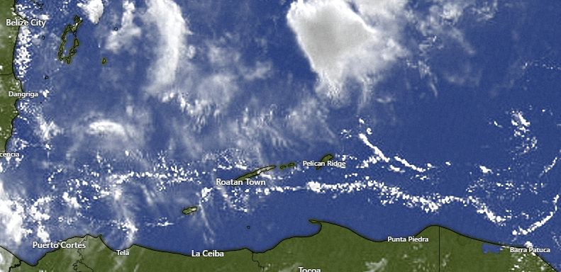 On satellite at 7 a.m. we see a thundershower to the southeast of Guanaja moving northwest. We will see if it can hold together to give us a shower this morning. Otherwise we will have partly cloudy skies and a shower here or there and the chances will increase as we get into the evening. Tomorrow looks drier, but from Monday evening through Wednesday morning it looks like we have good chances of scattered showers.