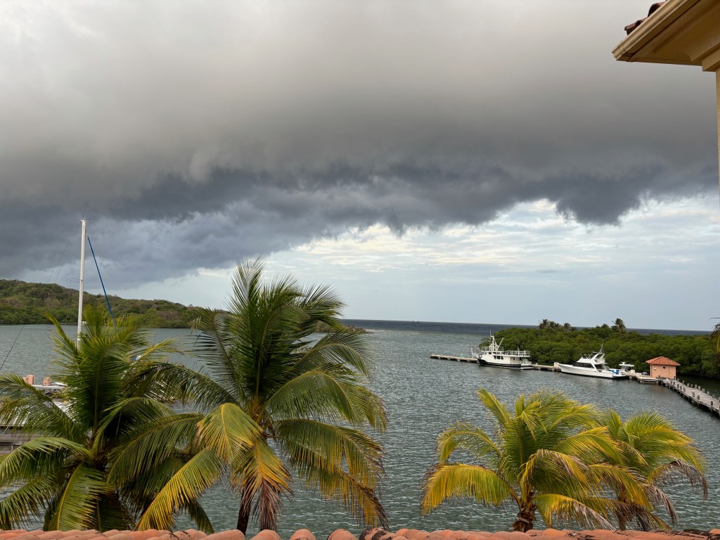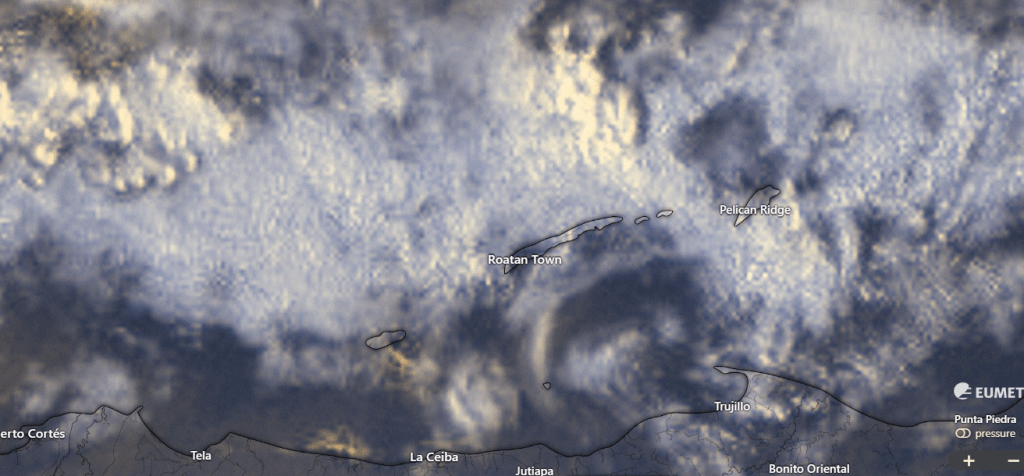 We can see the storm cranking up around 1 a.m. near Puerto Cortes where they picked up about an inch of rain. It passes over Utila around 3 a.m. (I don’t see any rain recorded at any of the three stations.) and moves north out to sea east of Belize. We have some clouds moving over us on the south side of this storm this morning but not a whole lot of rain.