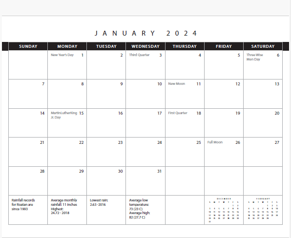 Here is what January looks like on our new Roatan Weather calendar. Average high is 82 (27.7C) and average low is 73 (23C) and average rainfall is 11 inches. Several of you have already reserved your copy and I’ll be in touch about delivery. They should be printed tomorrow. If you want to reserve yours, please message me or if you’re in the States or Canada go to http://tinyurl.com/roatanweather