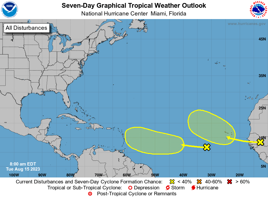 There are two disturbances on the latest National Hurricane Center outlook. The one on the left has a very low (10 percent) chance of development through the next seven days, but its motion is generally toward the Caribbean. While none of the major computer models are making much of this, they do put a lot of moisture into the Caribbean next week and, this time of year with these water temperatures, anything can happen. We’ll keep an eye on it. Have a great Tuesday!